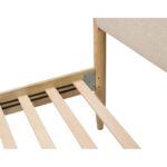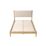 This platform bed is expertly constructed from solid and engineered wood, ensuring a robust and reliable frame that stands the test of time. The frame is supported by splayed legs finished in a warm light brown hue, adding a natural, organic charm that complements the bed’s sleek design. The legs not only enhance stability but also contribute to the mid-century aesthetic, making this bed a striking centerpiece for any bedroom.