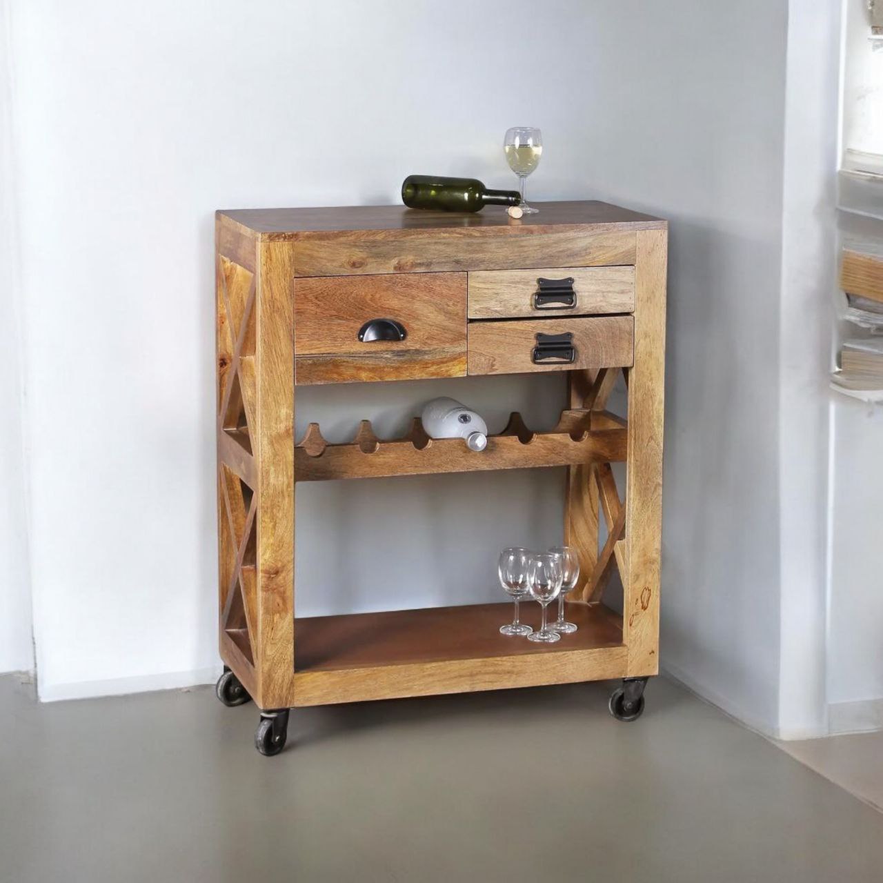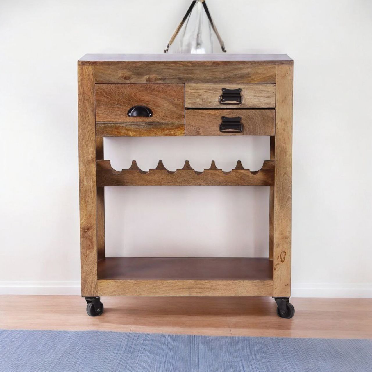 All wood bar cabinet products undergo an intense three-step treatment process to eliminate termites, borers, and pests. The wood used in crafting this cabinet is expertly seasoned to maintain optimal moisture levels, minimizing the risk of seasonal expansion or contraction. Each product is subjected to a rigorous three-stage quality inspection process, with over 50 quality checkpoints, ensuring every bar cabinet combines functionality, durability, and premium craftsmanship.